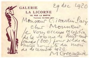 L.A.S. et C.A.S. décembre 1920, novembre 1921. 1 pp. in-4 et 1 pp. in-8 oblong à en-tête de la Galerie La Licorne. Gromaire accuse réception du chèque de 800 francs pour règlement d’une partie de ses mensualités ; il sera disponible pour dimanche et passera le voir à la galerie La Licorne ; il regrette de ne l’avoir pas vu à l’Automne.