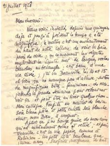 5 L.A.S. 1927-1928. 6 pp. in-4, 2 pp. in-8 avec adresses. 23 juillet : Il a passé ses vacances à bouquiner et à flâner, mais rapportera « tout de même » deux « 40 » ; il compte rentrer à Paris à la fin de la semaine, envisageant de le consulter comme dentiste. (…) Que devient le monde arts ? je reçois de temps en temps une vague coupure du Lynx qui est comme un petit écho affaibli du tumulte parisien. Rien ne vaut une bonne pipe en regardant filer les nuages (…). 1er octobre : il est étonné qu’il n’ait pas reçu sa lettre du mois d’août ; il fait part de ses vacances en Bretagne où il s’est blessé, laissant de côté le tennis ! (…) J’ai travaillé plus que je ne comptais le faire. Je voulais me reposer, mais le démon intérieur ne me laisse pas de trêve, et je rapporte onze toiles de dix, surtout des sujets maritimes. Evidemment ces petites toiles sont moins pénibles à échafauder que des grandes, mais j’en ai ma ration quand même, et en ce moment je me paie huit jours de nonchalance, avec dessins seulement de temps en temps. (…). 21 juillet 1928 : évoquant son magnifique été en Normandie et à Deauville ; (…) le matin c’est un enchantement du haut de notre colline de voir la baie parée de rose ; en ce moment les régates emplissent la haute mer de longues voiles blanches triangulaires ; c’est beau, d’une vie aisée ; j’ai vu Deauville les 14 et 15 eh bien ça ne manque pas d’allure ; surtout de magnifiques bêtes - féminines - de race. (…) Mon collègue Foujita en maillot de bain soie bleu pâle et petite culotte soie blanche était, mon Dieu, à croquer (…) . Gromaire peint des aquarelles à défaut de châssis pour tendre ses toiles ; Je prends mon bain quotidien en compagnie de Foufout qui est brun comme une noix de coco. Moi j’ai la gueule genre langouste. Tennis aussi quotidien (…). Pas très brillant mais on travaille (…). 21 septembre : l’invitant à passer dans son atelier ; (…) Vous verrez mes toiles dans d’assez mauvaises conditions (…) mais vous avez l’habitude (…).