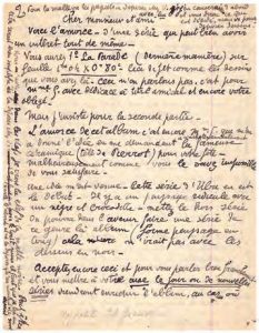 L.A. S.l.n.d. (1918). 2 pp. in-8. Rouault fait part de l’avancé d’un album de ses œuvres avec une série sur La Parade : Voici l’amorce d’une série qui peut bien avoir un intérêt tout de même. Vous aurez 1er La Parade ( dernière manière ) sur feuille 1m 04x0m80 ceci comme les dessins que vous avez là. Ceci n’en parlons pas, c’est pour Mme G avec dédicace à titre amical (…). Mais j’insiste pour la seconde partie. L’amorce de cet album c’est encore Mme G qui m’en a donné l’idée en me demandant à m’acheter amicalement la fameuse céramique ( tête de Pierrot ) pour votre fête ; Malheureusement, comme vous le savez, impossible de vous satisfaire. Une idée m’est venue. Cette série d’Ubu en est le début. Il y a un paysage ridicule avec un nègre et crocodile. Mettez le hors service on pourra dans l’avenir faire une série de ce genre là album (forme paysage en long ) cela n’irait pas avec les dessins en noir (…). Il enrichira l’album par d’autres séries ; il lui propose de récupérer des dessins à remettre à Vollard ; Si vous venez à Paris et que vous trouviez rue Mirosménil dans le fameux carton ( il n’y a que cela dedans ) un peu gondolé série de dessins assez grands ( j’ai donné la mesure à Mme G ) portez les chez la concierge de Vollard 28 rue de Grammont à côté du Crédit Lyonnais, vous marquerez le nombre et vous voudrez bien m’avertir du dépôt. Vous voudrez bien écrire sur le rouleau : dessins de G Rouault pour lui remettre. (… ) Pour la malle ou les paquets à déposer chez V j’en causerai d’abord avec lui et vous dirai ce qui est décidé mais vous pouvez déposer dessins (…).