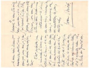 L.A.S. Montroig, Tarragona, 21 août 1921. 4 pp. in-12. Miro espère qu’il a reçu sa dernière lettre relative à Dalman ; il continue ses paysages : Je travaille les mêmes paysages dans le même but de les bien finir et de les bien expliquer. Ils vont encore m’occuper beaucoup de temps. J’en suis fort content et je serai heureux en vous les faire voir. Ma lentitude de travail m’a empêché de me servir de votre aimable invitation en vous envoyant quelque toile pour le salon d’automne. Il espère lui faire un envoi important, etc.