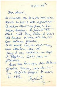 L.A.S. S.l., 24 juin 1936. 1 pp. in-4. Invitation à venir le voir à son atelier ; (…) Ne m’en voulez pas de ne pas vous avoir répondu de suite à votre si gentil mot, la maison étant ces jours ci sens dessus dessous. A présent tout étant rentré dans l’ordre, je serais très heureux de vous voir chez moi avec madame Girardin. (…). Joint une carte postale d’Auvergne, Lipchitz adressant ses bons souvenirs.