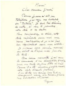 L.A.S. S.l.n.d., mardi. 1 pp. in-4 joint son enveloppe avec cachet de la base aérienne de Villacoublay. Il lui demande de lui permettre d’exposer sa toile au Salon des Tuileries, dont il vient de recevoir l’invitation ; Vous comprendrez ce désir, cette toile représente pour moi une bonne réalisation et je n’ai pas son équivalent dans mon atelier. Je passerai donc demain mercredi au début de l’après midi prendre la toile (…). Il lui annonce qu’il a reçu la commande d’une grande décoration pour l’école de Creil.