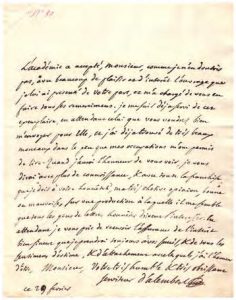 2 L.A.S. à Roucher. À Paris, 26 février au soir & 27 au matin (1780), 29 février. 3 pp. bi-feuillet in-4 dont avec adresse au verso, cachet de cire rouge. 26 février : Il remercie Rouher de l’envoie de son recueil de poèmes, Les Mois, qu’il a reçu par l’intermédiaire de Mr Pissot ; (…) Je ne perds pas un instant pour vous en témoigner ma reconnaissance quelques occupé que je sois actuellement d’objets bien étrangers à la poësie (…). Je ne doute point d’avance que la lecture entière de l’ouvrage ne me fasse encore plus de plaisir que ne m’en ont fait les excellens morceaux que je connaissais déjà par les lectures particulières (…). Il fera la lecture de sa lettre à l’Académie lundi ; d’Alembert ajoute le lendemain, qu’il offrira finalement son exemplaire à l’Académie ; Comme il y a déjà huit jours que l’ouvrage parait, il semble qu’il est convenable qu’elle le reçoive promptement (…). 29 février : D’Alembert lui adresse les remerciements de l’Académie pour les poèmes de Rouher. (…) Je me suis déjà servi de cet exemplaire, en attendant celui que vous voudrez bien m’envoyer pour elle, et j’ai trouvé de très beaux morceaux dans le peu que mes occupations m’ont permis de lire (…). Il l’invite venir le voir pour lui dire avec toute la franchise que je dois à votre honnêteté, ma très chétive opinion, bonne ou mauvaise, sur une production à laquelle il me semble que tous les gens de lettres honnêtes doivent s’intéresser (…). Joint la transcription par Emile Roucher, d’une troisième lettre de l’Alembert qui conseille de retrancher quelques passages (2 pp. in-8).
