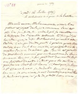 2 L.A. à sa femme. (Paris), ce mercredi (…) ; & ce jeudi 16 juillet 1789. 2 pp. sur bi-feuillets in-4, adresse au verso, cachet de cire noire. Apostille du fils de Roucher « le surlendemain de la prise de la Bastille ». Au lendemain de la prise de la Bastille : Roucher rassure sa famille sur sa santé après les mouvements insurrectionnels de la Capitale ; (…) Soyez tous sans crainte sur moi. Je ne suis pas imprudent. Rien de fâcheux ne m’est arrivé et il ne m’arrivera rien, j’espère. J’ignore si ce mot vous arrivera. On dit que les communications sont interrompues (…). Nuit et jour, on entend vingt et trente tocsins sonner à la foi (…). Le surlendemain de la prise de la Bastille : (…) Le roi est allé hier sans suite, sans garde, à pié se remettre à la sagesse de l’Assemblée nationale (…). Il n’a pas d’autre parti à prendre. Grâces soient rendues à qui l’a si bien conseillé (…). M. Bailli est prévôt des marchands, nommé par acclamation de la Commune (…). Roucher annonce qu’il est président du comité et du district pour la milice parisienne.