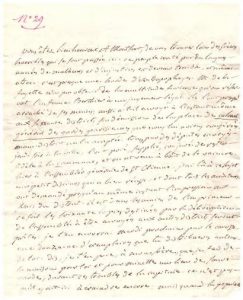 L.A. à sa femme. (Paris), ce samedi 25 juillet 1789. 2 pp. bi-feuillet in-4, adresse au verso, cachet de cire noire. Sur les événements révolutionnaires et le rôle de Lafayette ; Vous êtes bienheureux à Montfort, de vous trouver loin des scènes horribles qui se sont passées ici. Ce peuple irrité par de longues années de malheurs et d’injustice, est devenu terrible et même atroce. C’est presque une horde d’antropophages. Roucher fait part du massacre de Bertier de Sauvigny qui n’a pu être empêché par Lafayette ; celui-ci a envoyé aux 60 districts, sa démission de la place de colonel-général des Gardes parisiennes (…). Aucun district ne l’a acceptée. Tous, par des députés envoyés jeudi soir à la ville, l’ont prié, supplié, conjuré de rester fidèle à la Commune (…). Hier à l’assemblée générale de St-Etienne, j’ai lû à ce sujet un petit discours qui a bien réussi, et dont tous les auditeurs ont demandé presqu’au même instant l’impression (…). Le discours est chez l’imprimeur et va être distribué aux autres districts : il fera parvenir par carrosse à sa femme, une douzaine d’exemplaire qu’il demande de distribuer ; il demande de se mettre à l’abri avec son frère durant les troubles ; Ce n’est pas qu’il y ait ici à craindre encore ; mais quand la populace se tourne vers le brigandage et la férocité, il faut se tenir sur ses gardes (…). Il rassure sur son sort et ses déplacements qu’il limite à son district de St-Etienne et à l’Hôtel de ville pour plusieurs députations dont auprès de Bailly ; il va ce soir apporter son discours à Lafayette : quand on marche dans Paris comme député du tiers, on est en pleine et parfaite sécurité (…). Il voudrait lui envoyer un billet qu’il ne peut changer en numéraire et demande des nouvelles de la famille.