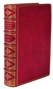 1590 ; in-4 de [1] f., 600 pp., [5] ff. (le dernier paginé 605-606), maroquin rouge, dos à nerfs orné, triple filet doré en encadrement sur les plats, double filet doré sur les coupes, dentelle intérieure, tranches dorées. Édition originale mythique des trois premiers livres de La Reine des fées. Malgré le titre qui en annonce 12, il n’est jamais paru que 6 livres (les trois derniers en 1596). Cette œuvre monumentale est le premier grand poème épique de la littérature anglaise et l’héritage majeur d’Edmund Spencer (1552-1599). Une gravure sur bois représente un chevalier terrassant un dragon. Après la page 589, on trouve une lettre de l’auteur au Sir Walter Ralegh, précédée d’un portrait gravé de ce dernier. Au dos de la page de titre, la dédicace à la reine Elizabeth, souvent manquante, est bien présente. La page 332 contient des espaces blancs destinés à accueillir des mots gaéliques. La page de titre est restaurée, encollée et réenmargée. Ex-libris héraldique de John Whipple Frothingham, musicien, collectionneur et philanthrope américain du début du XXe siècle. Graesse, Trésor de livres rares et précieux, VI, p. 465.