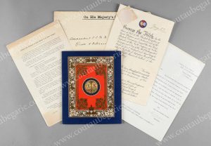 6 juin 1915, sur papier à en-tte, avec cachet à froid et signature autographe du roi George V George R. I. de Grande-Bretagne en haut du document, conservé avec son enveloppe d'origine. Texte en anglais. Format in-folio.