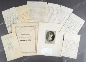 Composé de 31 lettres et notes biographiques des membres de l'entourage de la princesse, une invitation de la duchesse de Bassano, les cachets en cire du prince Radziwill et du comte Benkendorff (souvenir du 1er jour de l'an Russe (13 janvier 1851) à l'Hôtel du Rhin, Bade ; L.A.S. de la princesse Stéphanie de Bade, adressée au prince Louis Napoléon, concernant le Vicomte de Beauchesne, avec son enveloppe et sur papier à en-tte de son monogramme ; deux L.A.S. de M. Armand Le Febure, Ministre de France prs de SAR le Grand-duc de Bade, adressées au Vicomte; une L.A.S. du Baron de Steten, aide de camp du Margrave Guillaume de Bade ; trois L.A.S. de la princesse Stéphanie de Bade adressées au Vicomte sur papier à en-tte à son monogramme ; trois L.A.S. de la duchesse Marie-Amélie d'Hamilton dont une sur papier à en-tte à son monogramme, conservées avec leur enveloppe ; invitation avec placement de table pour un d”ner au Palais des Tuileries par l'empereur en l'honneur de la grande-duchesse de Bade ; deux menus, dont l'un en présence de la princesse de FŸrstenberg ; trois pomes du Vicomte en l'honneur de la grande-duchesse Stéphanie de Bade ; une gravure représentant un portrait de la grande-duchesse Stéphanie ; le mémoire pour S.A.R. Madame Marie-Caroline de Bade, duchesse d'Hamilton, contre M. James Hamilton, 58 pages imprimées, in-folio ; deux publications biographiques en allemand sur la grande-duchesse de Bade, etc...