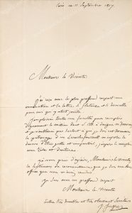 INGRES Jean-Auguste-Dominique (1781-1867). Célbre peintre Franais. L.A.S. Ingres adressée au vicomte de Beauchesne le 11 septembre 1827, Paris, 1 page, in-4°, pliures mais bon état. On y joint son faire-part de décs ainsi qu'une invitation...