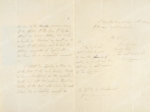 mouillures mais bon état; la seconde adressée au vicomte de la Rochefoucauld le 16 novembre (?), Paris, 1 page, in-8¡, pliures mais bon état. On y joint l'enveloppe d'envoi au vicomte de Beauchesne comportant des traces de cachet de cire rouge, ainsi qu'une gravure représentant Lawrence par J. Thomson.