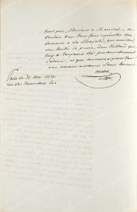 MERLIN DE DOUAI Philippe-Antoine (1754-1838). Ministre de la Justice durant les Cents-Jours. L.A.S. Merlin adressée à un maréchal et datée du 31 mai 1831, Paris, 1 page _, in-folio, par laquelle il remercie par avance son interlocuteur...