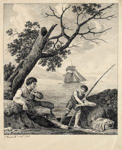 TAUVEL J. - ECOLE DU XVIIIe SIECLE. Repos du pcheur et Jeune pcheur et son pre. Dessins à la plume d'aprs des gravures d'époque, datés de 1796 et signés J. Tauvel. On y joint une gravure rehaussée à la sanguine d'aprs un dessin de F....