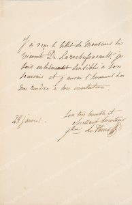 Beauchesne, 1 page, in-folio de cachet en cire. On y joint une lettre manuscrite signée Guillaume Le Thiere (1760-1832), avec notes autographes signées au bas du document H. Vernet, datée du 8 décembre 1828, 1 page, in-folio. Ainsi qu'une note signée Guillaume Le Thiere adressée au vicomte de La Rochefoucault. Bon état.