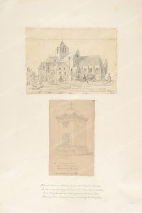 BEAUCHESNE Alcide, Vicomte de (1804-1873). Vue de l'Eglise de Laeken, o sont provisoirement déposés des restes de Louise d'Orléans, reine des Belges. Dessin à l'encre noire, datant de 1850. A vue: 12 cm L.: 17 cm.