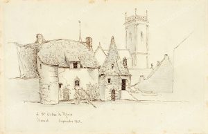 Rhuis, septembre 1838; Maison prs de Lannion, lundi 12 novembre 1838; Porte de Quimper et Couple de paysans 1838; A la Pointe du Raz, jeudi 25 aout 1838. Ensemble de huit dessins à la mine de plomb, certains signés de son monogramme, identifiés et datés de 1854 à 1857. Dimensions diverses.