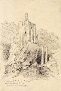 Roche Guillebaud sur lalisre du Berry 29 avril 1870; Eglise de Bouzeville Mercredi 16 septembre 1857; Château du Lat. Dimanche 1er octobre 1838; Château de Montagrier en Haute Vienne. Dessin d'adolescence 1818-1820; Eglise fortifiée. Jeudi 21 juillet 1864; Château du Luat, non loin d'Ecouen.Ensemble de dix dessins à la mine de plomb, certains signés de son monogramme, identifiés et datés de 1818 à 1864. Dimensions diverses.