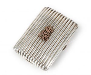 ISABELLE II, reine d'Espagne (1830-1904). Etui à cigarettes en argent, à larges godrons verticaux, de forme rectangulaire, légrement bombé, couvercle à charnire orné au centre de son monogramme en or Y 2 (Isabelle II) sous couronne royale,...