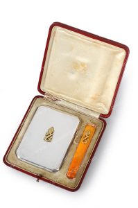 prises sur la partie droite. On y joint un fume-cigarette en ambre appliqué du mme monogramme en or. L'ensemble est conservé dans son écrin d'origine de la Maison Carl Heiss à Vienne, en maroquin rouge, intérieur velours et soie. Usures du temps, mais bon état. Poinon titre : Vienne, circa 1900,1910. Poinon d'orfvre : Carl Heiss. H. : 8, 5 cm L. : 6, 5 cm - E. : 1 cm. Poids. : 89 grs.