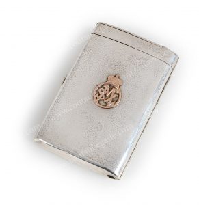 MAX, prince de Schaumburg-Lippe (1898-1974). Etui à cigarettes en argent martelé, de forme rectangulaire, légrement bombé, couvercle à charnires orné au centre de son monogramme en or M.S.L. (Max Schaumburg-Lippe) sous couronne princire,...