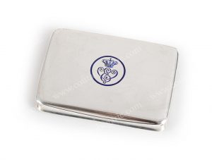 royale d'Italie en émail bleu, intérieur vermeil. Poinon titre : 800, Rome, circa 1920,1930. Poinon d'orfvre : A. G. Usures du temps, mais bon état général. L. : 7, 5 cm P. : 5, 5 cm - E. : 1, 5 cm. Poids. : 93 grs.