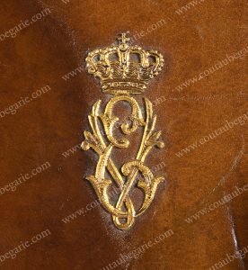 sertie de roses de diamants et d'un diamant plus important, l'ouverture se fait sur la partie droite par bouton poussoir rectangulaire en or, serti d'un saphir cabochon. Conservé dans son écrin d'origine en maroquin appliqué du monogramme du roi, de la Maison Fratelli Cagli à Rome, intérieur velours et soie. Usures du temps, mais bon état général. L. : 9 cm L. : 8 cm - E. : 1, 5 cm.