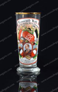 MAISON GRAND-DUCALE DE HESSE. Verre commémoratif légrement évasé vers le haut, orné au centre d'un portrait représentant le grand-duc Louis-Ernest de Hesse sur fond de trophées et de drapeaux, surmonté de la date 1912-1914. Travail allemand...