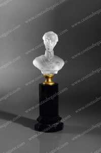 ECOLE AUTRICHIENNE DU XIXe SIECLE. L'empereur François-Joseph d'Autriche (1830-1916), à l'époque de son accession au trône en 1848. Buste en cristal dépoli reposant sur un socle colonne de forme hexagonale en verre noir. Légers accidents,...