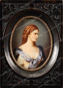 ECOLE DU DEBUT DU XXEME SIECLE. Portrait d'Elisabeth, impératrice d'Autriche (1837-1898). Miniature sur ivoire, de forme ovale, la représentant en buste, posant légrement de trois quarts, un châle en dentelle noire sur les épaules, conservée...