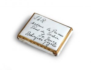[SERBIE]. Boîte en émail ornée sur le couvercle d'une inscription SAR, Madame la princesse Pans de Serbie. Travail du XIXe sicle. Important accidents, en l'état. H. : 6, 5 cm L. : 8 cm.