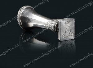 CACHET EN ARGENT. En argent, gravé du double monogramme AA sous couronne royale. Travail étranger du XXe sicle, sans poinons apparents. L. : 11 cm L. : 4 cm. Poids brut : 72 grs.