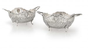 PAIRE DE CONFITURIERS. En argent à décor ciselé de guirlandes de fleurs enrubannées, ornés de ttes de chérubins, ajourés sur la partie, reposant sur quatre pieds. Bon état général, manque l'intérieur. Travail anglais, Londres, circa...