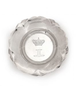 LEOPOLD III, roi des Belges. Ensemble de deux cendriers de table en argent, a décor de fleurs, gravés au centre de son monogramme LL sous couronne royale. Usures du temps, mais bon état. Travail de la Maison Okubo. H : 1, 5 cm Diam. : 7 cm.Poids...