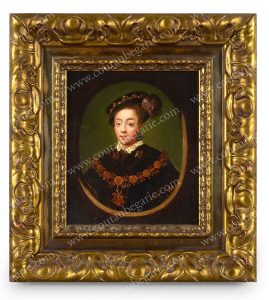 ECOLE ETRANGERE FIN DU XVIIe SIECLE. Portraits du roi Henry d'Angleterre (1491-1547) et son fils le futur roi Edward VI (1737-1753). Paire de miniatures sur cuivre les représentant en buste, conservées dans des cadres modernes en bois doré....