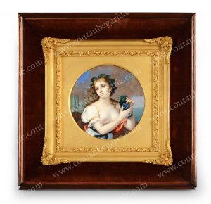 ECOLE ETRANGERE DU XIXe SIECLE. Portrait de Lady Hamilton (1768 -1815) en bacchante. Miniature peinte sur ivoire de forme ronde, présentée dans son cadre d'origine en bronze doré ciselé à décor de sarment de vigne, appliqué sur un fond en...