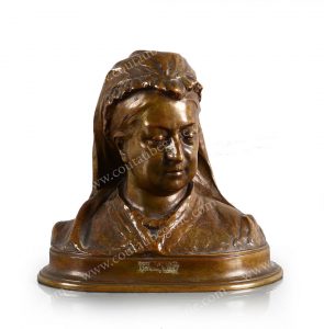 MAUBERT L. Ecole du XIXe sicle. Buste de la reine Victoria de Grande-Bretagne. Bronze à patine verte, signé au dos, la représentant portant le voile de veuve. Bon état. H. : 14 cm - L. : 16 cm.