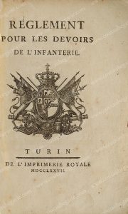 [INFANTERIE]. Rglement pour les devoirs de l'infanterie, Turin, par l'imprimerie royale, 1767, 94 pages dorées sur tranches. In-4°, reliure d'époque en maroquin rouge, dos lisse orné, pice de titre en maroquin vert, titre en lettres d'or,...