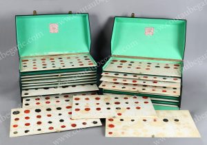 familles royales, classés par ordre alphabétique et répartis sur 24 planches, avec annotations d'identification, dont : Archiduc Maximilien d'Autriche; Prince d'Arenberg; Blason d'alliance Autriche-Savoie; Blason d'alliance Autriche-Bavière; Beaumont; Bourbon-Busset; Broglie; Beauffremont-Montmorency; Bryas; Blason d'alliance Brésil-Naples; Blacas; Blacas-Dams; Gallard de Bearn; Chevenon de Bigny; Borelli-Bryas; Béthune; Brosse; Colbert; Cambray-Maillé, Chastenet; Candé-Brillet; Chevigny; Carayon la Tour; Choiseul; Clermont-Tonerre; Chabannes; Castries; Cossé; Des Cars; Esterhazy; reine d'Espagne et de Portugal; Blason d'alliance Espagne-Autriche-Este; Louis XIX, Henry V; Madame Royale; reine de France; Foresta; Furstemberg; Dauphin de France; Dauphine de France; France-Berry, Bourbon Naples; Buffo de la Fare; Grimaldi; Harcourt; Kersaint; LA Rochefoucauld; La Bourdonnaye; Luccheni-Palli; Levis; La Pénouse; Archiduc e Modene; Duc de Modne; Montesquiou; Merode; Mailly; Montalembert; Montrichard; Naples-Autriche; Bourbon-Naples; Parme; Bourbon-Parme; Bourbon-Parme France; Praslin; Polignac; Palaiseau; Rohan; Sardiagne-Autriche; Bourbon-Carignan; Vogué, Villeneuve; etcÉ . L'ensemble est conservé dans deux coffrets en carton vert. Usures du temps, rousseurs, quelques manques, bon état. Travail de la Maison Farin à Paris. Planche : L. : 43 cm L. : 29 cm. Planche : H. : 20 cm L. : 44 cm - P. : 25 cm.