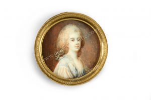 ATTRIBUEE JOHANN ERNST HEINSIUS (1740-1812). Travail Franais de la fin du XVIIIe sicle. La comtesse du Barry, née Jeanne Bécu (1743-1793). Portrait miniature peint sur ivoire, conservé dans un encadrement en bronze doré, avec pied chevalet au...
