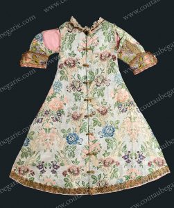 rameaux de roses, tulipes, iris et Ïillets, sur un contre-fond argent travaillé en diagonales et d'un ruban tors en trompe-l'Ïil soulignant les rabats de poches. Dentelle aux fuseaux or sur le pourtour; dos boutonné dans un lampas broché en soie polychrome de la mme époque, doublure en bougran rose, bon état. L'usage de faire don au clergé des étoffes précieuses des robes de cour déjà portées au cours d'une occasion est fréquent au XVIIIe sicle. L'Eglise les convertit alors en ornements liturgiques dont des robes de statue. La richesse de la broderie de cette robe de statue désigne un destinataire originel, jeune garon ou jeune fille, issu de la meilleure aristocratie, peut-tre princire ou royale. Premire moitié du XVIIIe sicle.