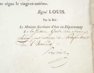 manuscrite sur papier en partie imprimée, à en-tte du Ministre de l'Intérieur et au nom du roi, avec signature autographe du garde des Sceaux et cachet à froid aux armes de France. On y joint une ordonnance royale, pice autographe établie au nom du roi, concernant le collge électoral de Soisson Pliures, bon état. H.: 39, 5 cm L.: 53, 5 cm.