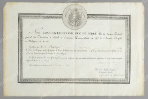 imprimée en partie manuscrite, surmontée des grandes armes de France, signée par le prince au bas du document Charles Ferdinand et contresignée par son secrétaire général, rousseurs sur le bords, mais bon état. H.: 33 cm L.: 50 cm.