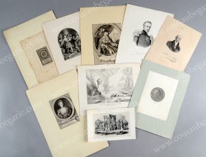 FAMILLE ROYALE DE FRANCE. Ensemble de neuf gravures et lithographies anciennes, représentant des portraits et des scnes historiques: L'entrevue du roi Louis XI et de son frere, Le roi Louis XV et Damien, Charles-Philippe de France, Le Comte...