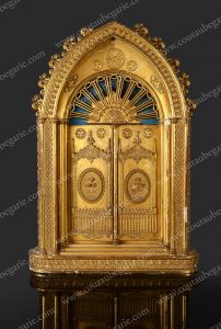 reliquaire de style Néo-Classique en bois doré. Petits accidents et usures du temps au cadre, bon état. Cadre: H. : 79 cm L.: 51 cm. Portrait : H.: 26 cm L.: 20 cm.