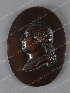*LOUIS XVI, roi de France et MARIE-ANTOINETTE, reine de France. Paire de médaillons en bronze, à patine brune, de forme ovale, aux profils des souverains. Travail Franais du XIXe sicle. Bon état général. A vue: H.: 7 cm L.: 5, 5 cm. Cadre:...