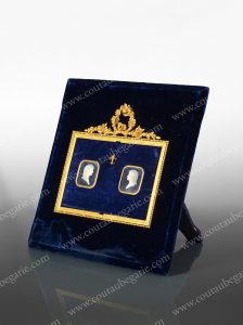 couleur bleu, orné au centre d'une fleur de lys dans un entourage en bronze doré surmonté d'une couronne de fleurs enrubannée, avec pied chevalet au dos et attache de suspension. Usures du temps au cadre, bon état. Miniature: H. : 3, 5 cm L.: 3 cm. Cadre: H.: 24, 5 cm L.: 22 cm.