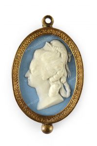 *MARIE-ANTOINETTE, reine de France. Petit médaillon en biscuit de Svres, faon Wedgwood, de forme ovale, représentant un profil de la reine, la tte tournée vers la gauche, conservé dans un encadrement en bronze ciselé et doré. Travail...