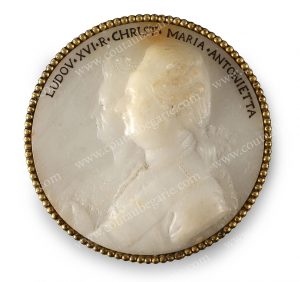 *LOUIS XVI, roi de France et MARIE-ANTOINETTE, reine de France. Grand médaillon à suspendre, de forme ronde, en albâtre, conservé dans un entourage en bronze à décor de perles dorées. Travail Franais du XVIIIe sicle. Usures du temps,...
