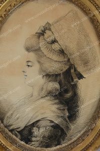 *BERNARD Jean-Joseph (1740-1809). Portrait présumé de Madame Auguié (1758-1794), femme de chambre de la reine Marie-Antoinette. Dessin calligraphié à la plume, la représentant en buste, vue de profil, la sÏur de Madame Campan, conservé sous...