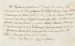 FAVRAS Thomas Mahy, marquis de (1745-1790). Pendu en place de Grve le 19 février 1790. Pice autographe recto-verso signée Mahy de Farras datée du 30 mars 1772, Paris, 2 pages, in-12¡. On y joint une notice biographique de Favras par...