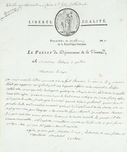 Monsieur Levéque, Poitier, 10 Floréal de l'An II, 1 page, in-4°, pliures, rousseurs, bon état général. On y joint une gravure représentant son portrait par Jules Porreau et la copie manuscrite d'une lettre datée du 20 mars 1793 adressée au ministre de la Guerre, le citoyen Beurnoville.